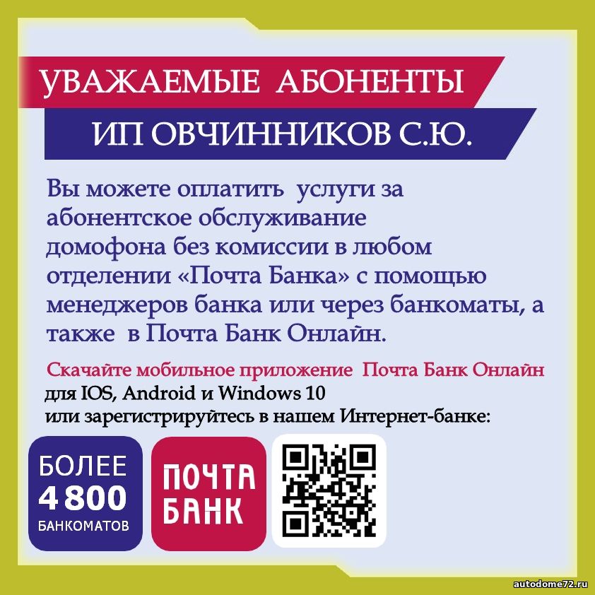Вы можете оплатить услуги за абонентское обслуживание домофона без комиссии в любом отделении «Почта Банка» с помощью менеджеров банка или через банкоматы, а также в Почта Банк Онлайн.