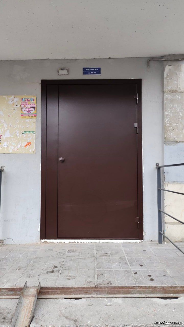 Подъездные двери предназначены для эксплуатации с переговорно-замковым устройством (домофоном) в многоквартирных домах. Двери однодольные, изготовлены из металла 3мм (2 листа по 1.5мм). В конструкции дверей предусмотрены усиления в местах установки пульта домофона, эл. магнитного замка, гидравлического доводчика, полотно двери на трёх усиленных навесах с утеплителем и D-образным уплотнителем 21х15мм по периметру. Двери окрашены порошковой краской, внутри предусмотрены каналы для скрытой(антивандальной) прокладки проводов к пульту домофона и эл.замку, утеплитель в дверях- минеральная вата высокой плотности. Ручка антивандальная «Грибок».